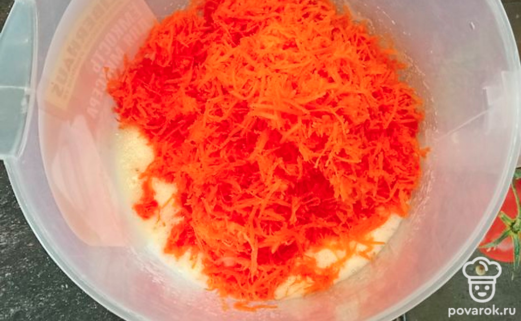 Взбить яйцо с сахаром. Добавить морковь и перемешать.