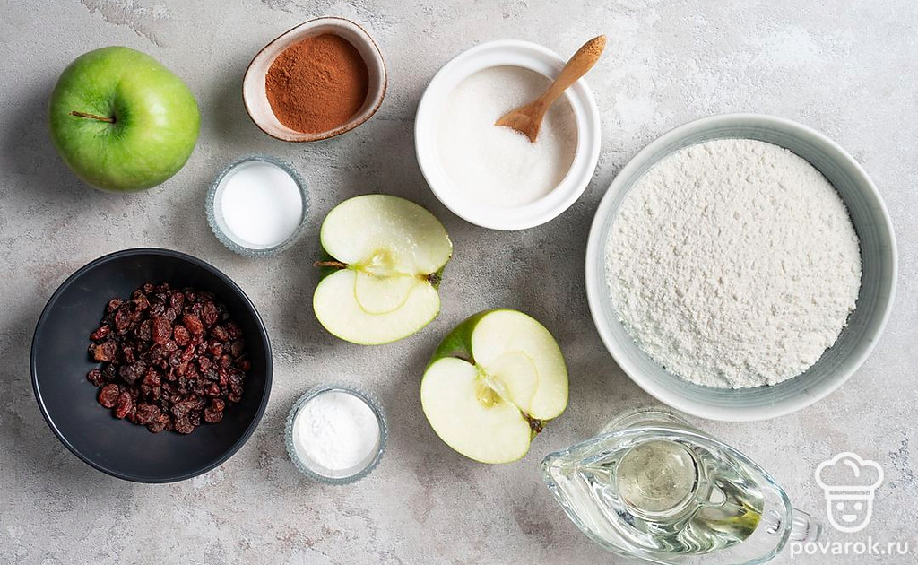 Муку просейте. Изюм залейте кипятком, затем промойте под холодной водой и обсушите. Яблоки вымойте, удалите сердцевину и разрежьте на 4 части каждое. Форму для выпечки застелите пергаментной бумагой. Разогрейте духовку до 180 градусов.