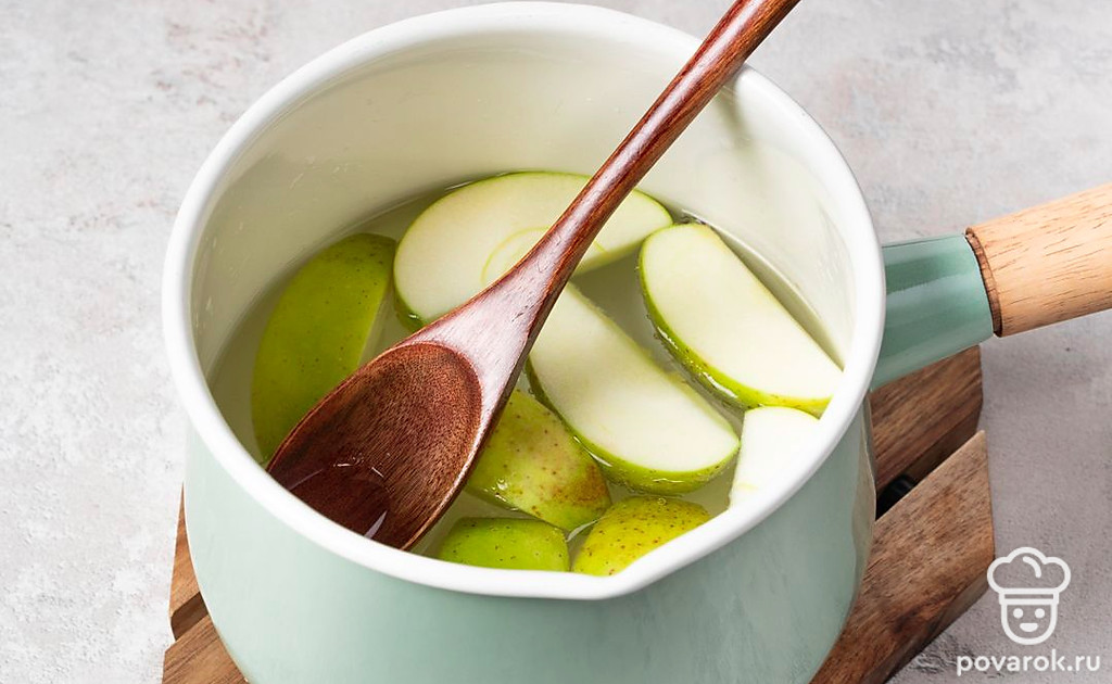 Приготовьте яблочный отвар. Налейте воду в кастрюлю, вскипятите, добавьте сахар и яблочные дольки. Прокипятите 5 минут, затем снимите с огня, накройте крышкой и оставьте настояться на полчаса. Перед приготовлением теста отвар полностью остудите.