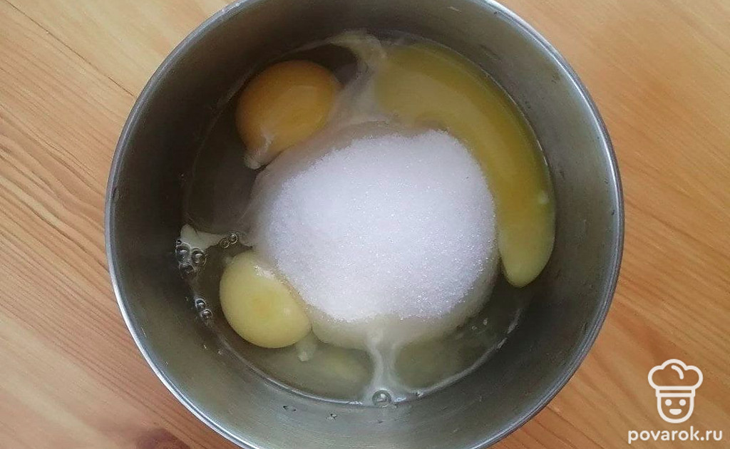 Взбейте яйца вместе с обычным и ванильным сахаром в однородную пышную массу. Она должна хорошо увеличиться в объеме и побелеть.