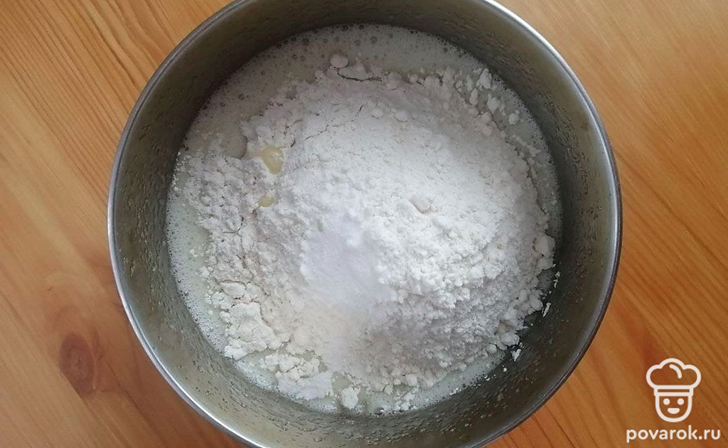 Смешайте вместе разрыхлитель, муку и соль. Перемешайте. Просейте полученную смесь через сито в емкость с яичной массой. Еще раз тщательно перемешайте.