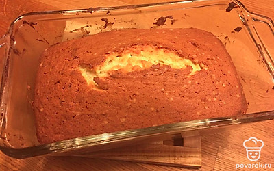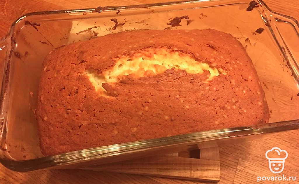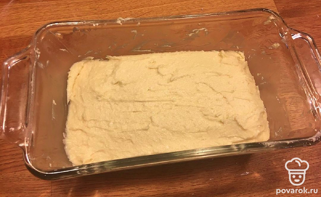 Переложите в форму творожную массу и при помощи лопатки разровняйте поверхность будущего кекса. Выпекайте в предварительно разогретой духовке 80 минут при температуре 170 градусов.