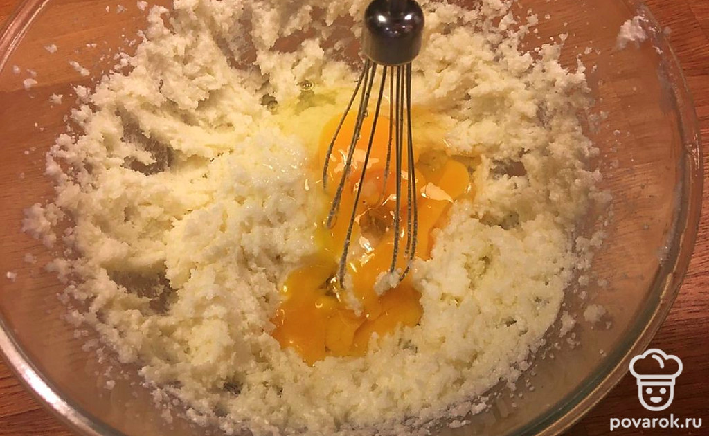 Добавьте яйца, снова взбейте до однородного состояния.
