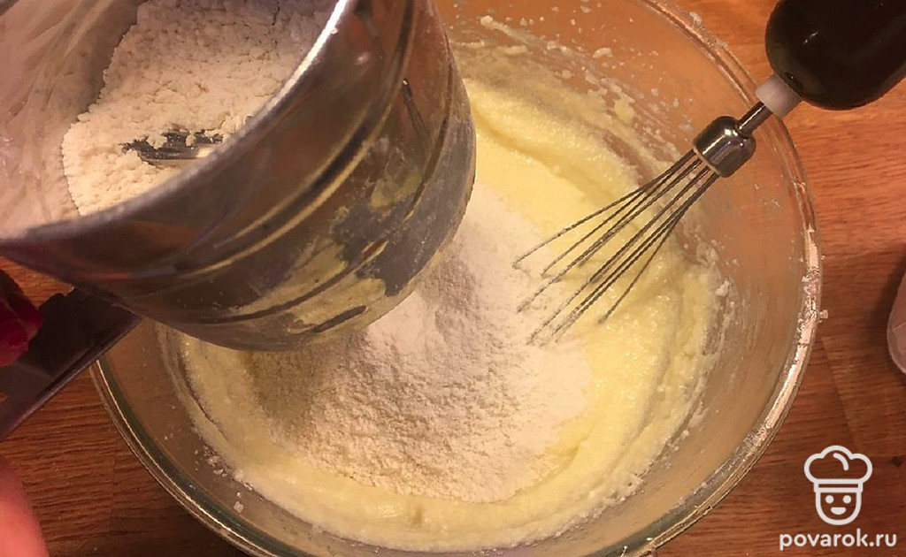 Просейте в миску муку и разрыхлитель. Размешайте.