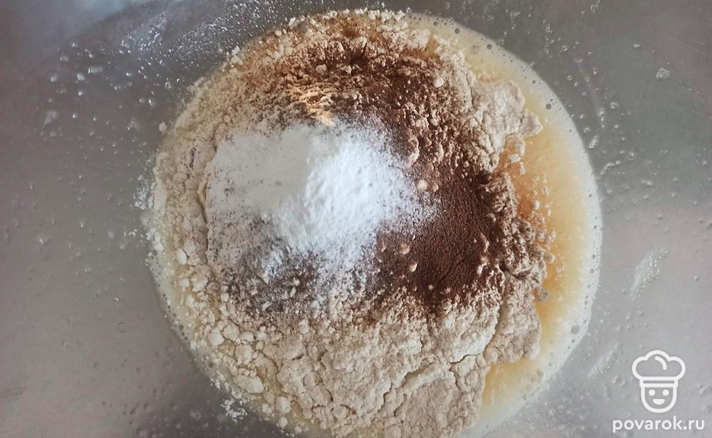 Добавьте просеянную муку, цикорий и разрыхлитель. Перемешайте.