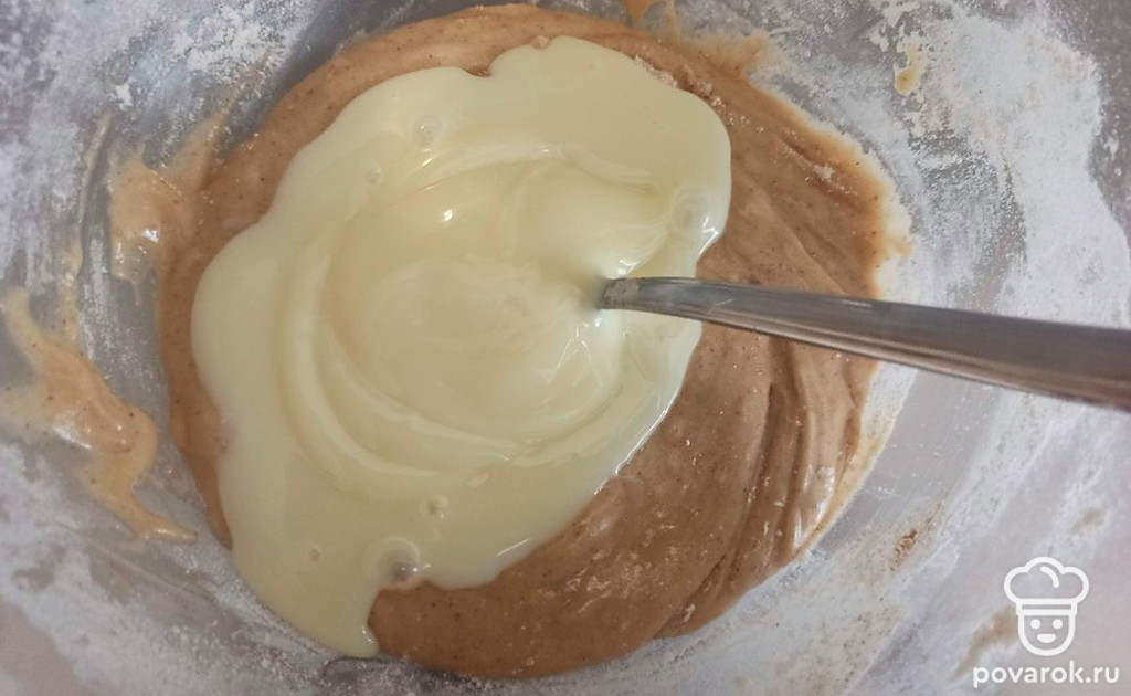 Добавьте сгущенное молоко и хорошо перемешайте.