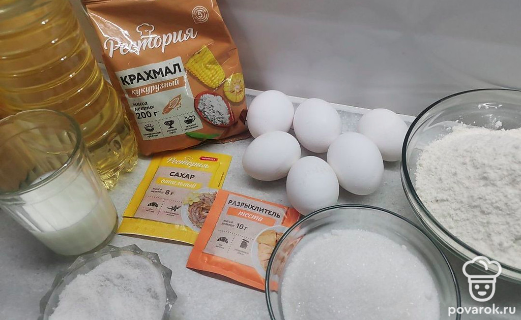 Подготовьте все ингредиенты. Яйца, растительное масло и молоко должны быть комнатной температуры. Яйца — размера С1.