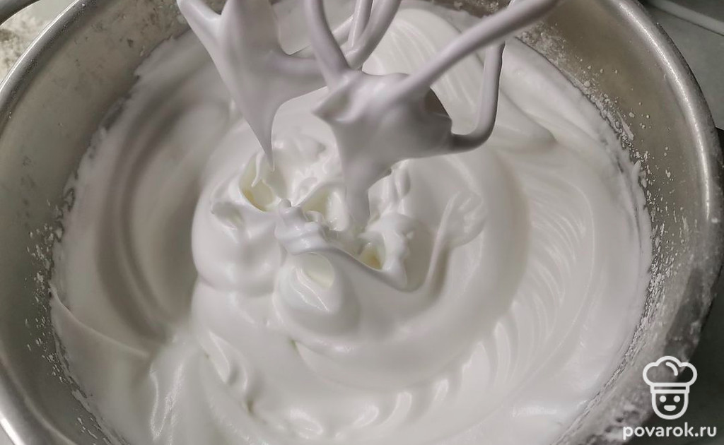 Взбивайте еще 3 минуты, до пышности. Белки должны быть с подрагивающими пиками, а не совсем плотными.