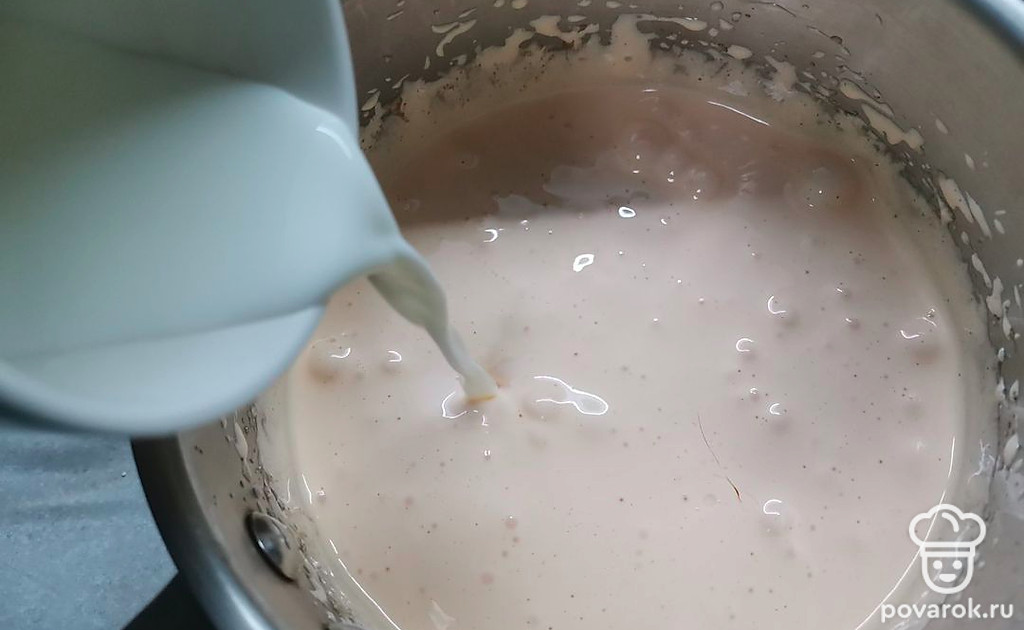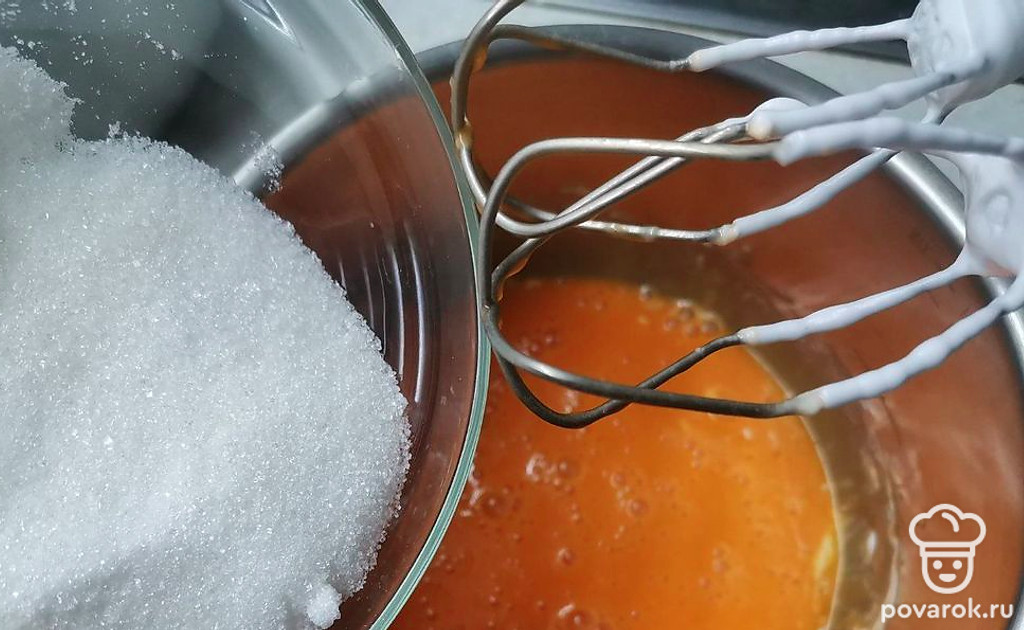 К желткам добавьте оставшийся сахар. Взбивайте до пышности около 3 минут.