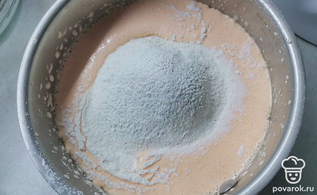 Введите ко взбитым желткам просеянную муку и разрыхлитель. Аккуратно тщательно перемешайте, не взбивая.