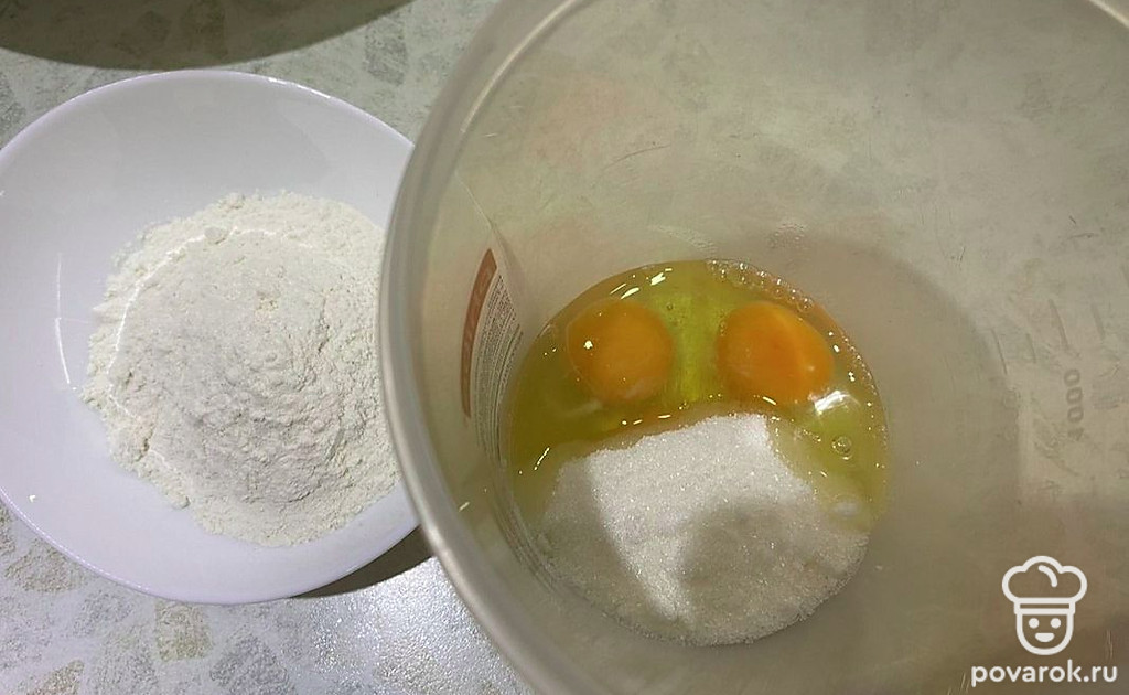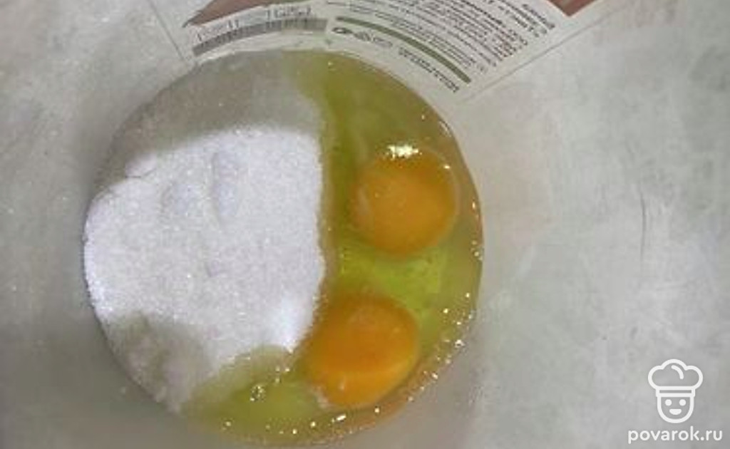 В миску для взбивания к яйцам добавьте сахарный песок.