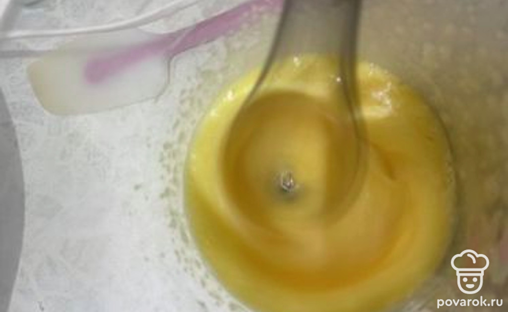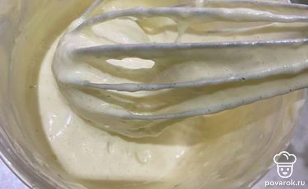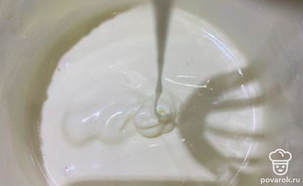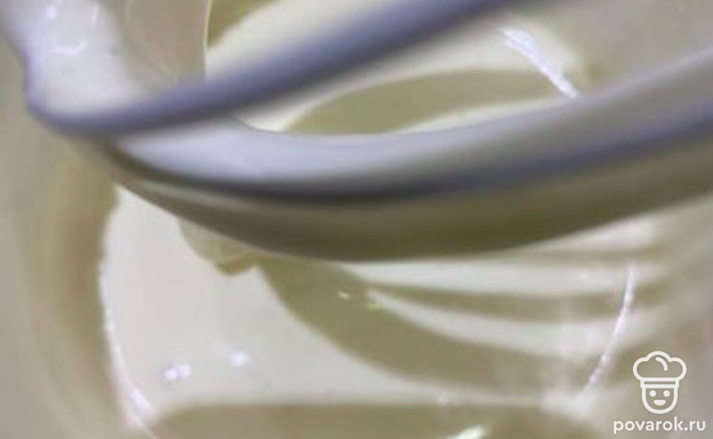 Проверьте смесь: когда яичная масса стекает с венчика, должен оставаться рисунок, а затем исчезать. Так вы поймете, что масса хорошо взбита.
