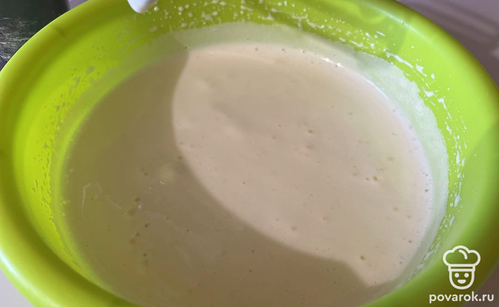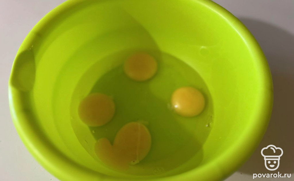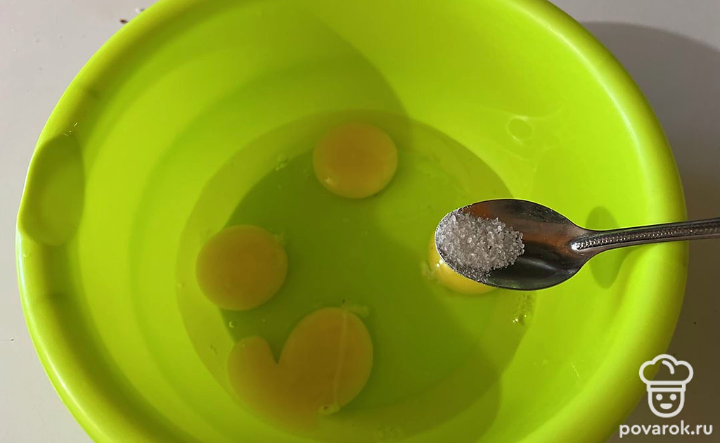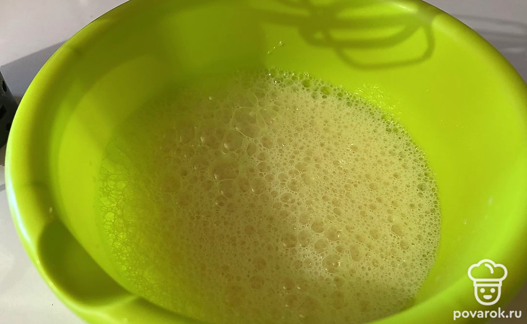Взбейте яйца с солью на средних оборотах миксера до легкой пены.