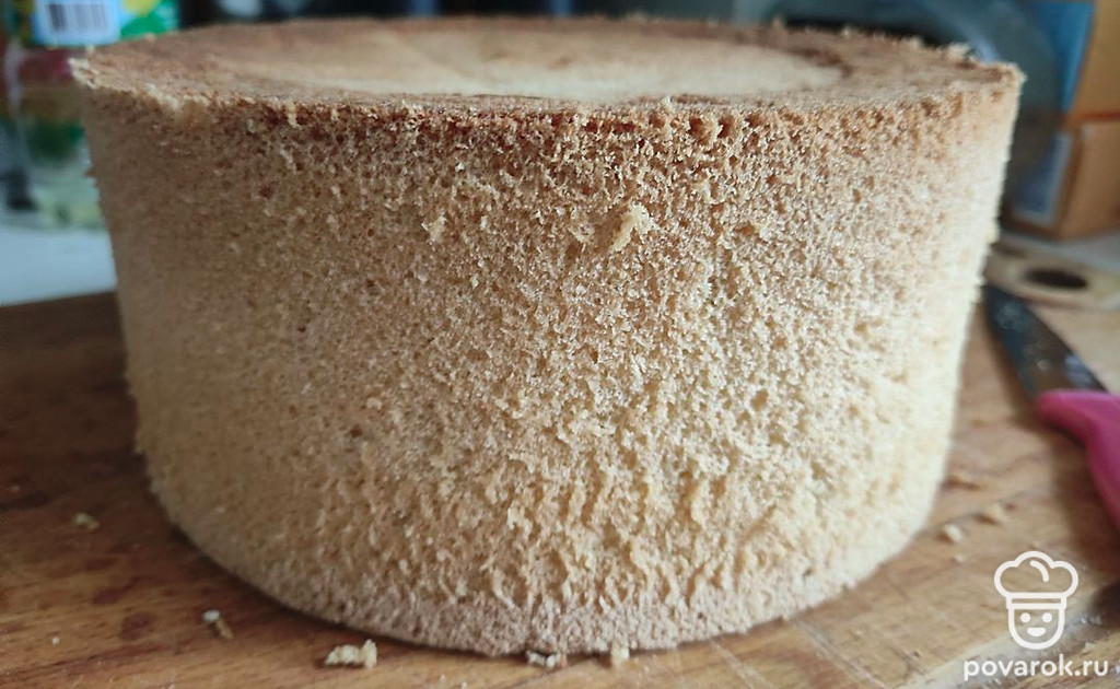 Достаньте из духовки, дайте остыть 15 минут, переверните. Аккуратно тонким ножом пройдитесь вдоль стенок формы, выньте бисквит. Оберните пищевой пленкой и отправьте в холодильник на 8-10 часов. Так бисквит будет плотнее и не будет крошиться при разрезании.
