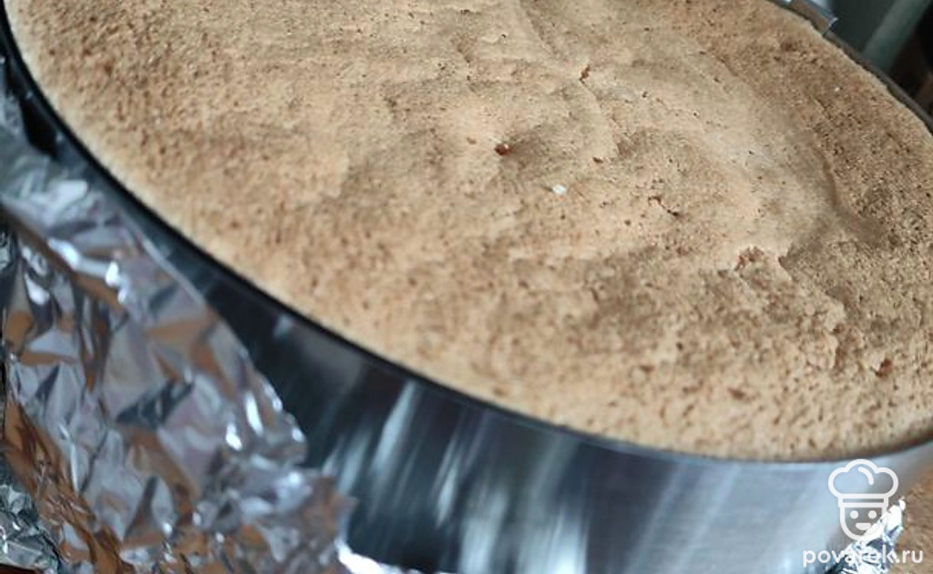 Я выпекаю в разъемном кольце, дно закрываю плотной фольгой. Если у вас форма с дном, застелите дно фольгой или подложкой для выпекания. Форму не смазывайте! Бисквит цепляется за стенки, когда начинает подниматься. Скользкие стенки будут ему мешать.