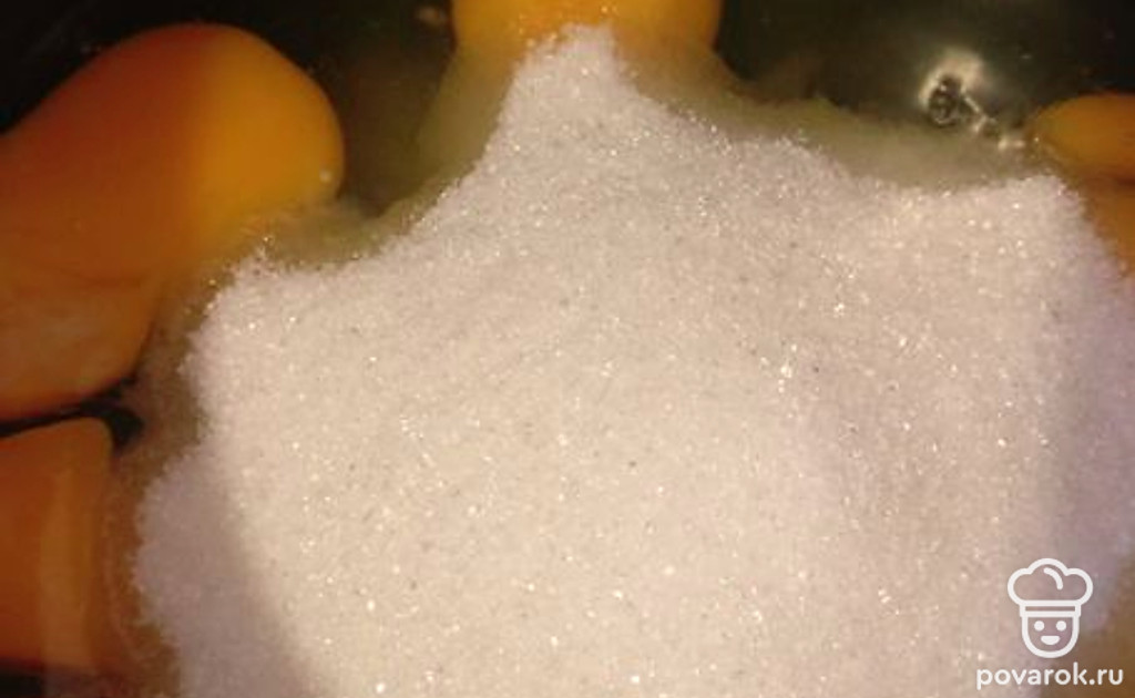 Яйца и сахар взбиваем вместе, не меньше, чем 1,5-2 минуты на каждое яйцо. Смесь должно посветлеть и увеличиться в размере.