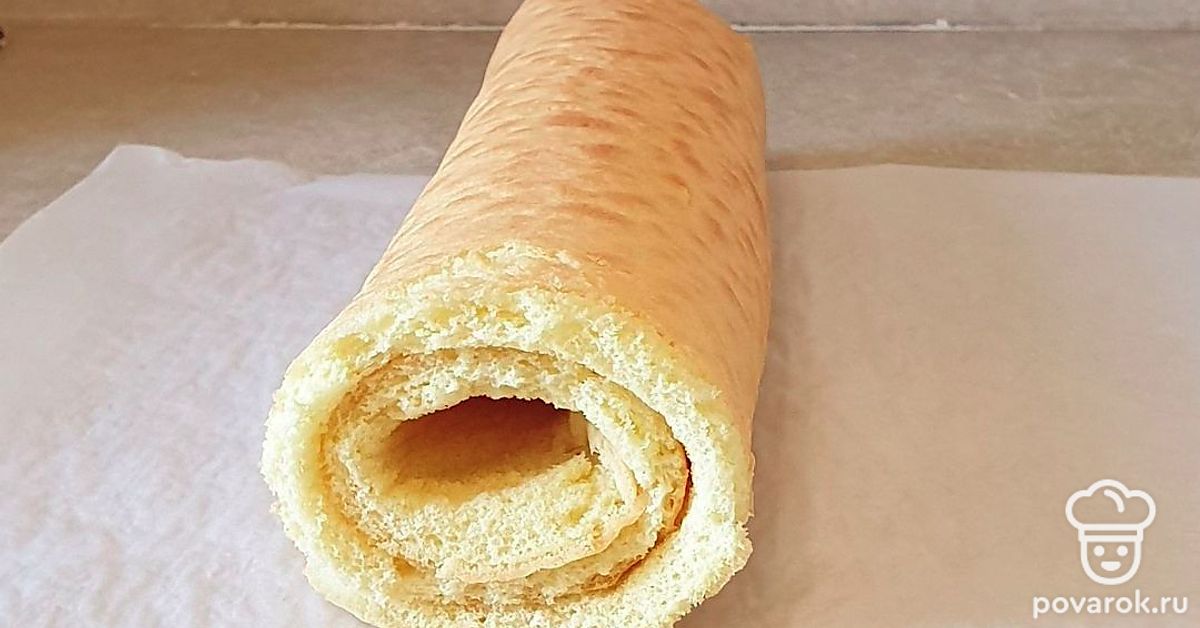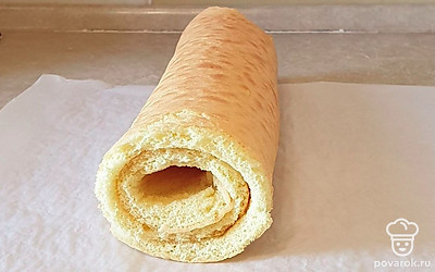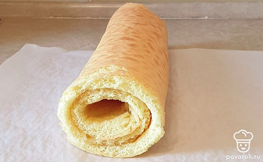Готовый бисквит сразу переверните верхушкой вниз, выложив на полотенце или пергамент. Бумагу, на которой выпекался корж, аккуратно снимите, дайте полностью остыть. Бисквит не нужно скручивать в рулет заранее, он и после остывания остается эластичным и хорошо скручивается.