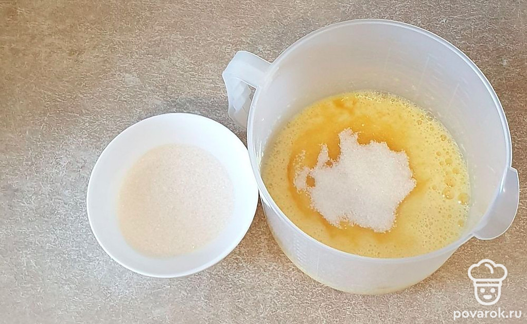 К яйцам постепенно подсыпайте сахар и ванильный сахар, не прекращая взбивания. Яйца смешивайте около десяти минут. Масса должна увеличиться в объеме и посветлеть.