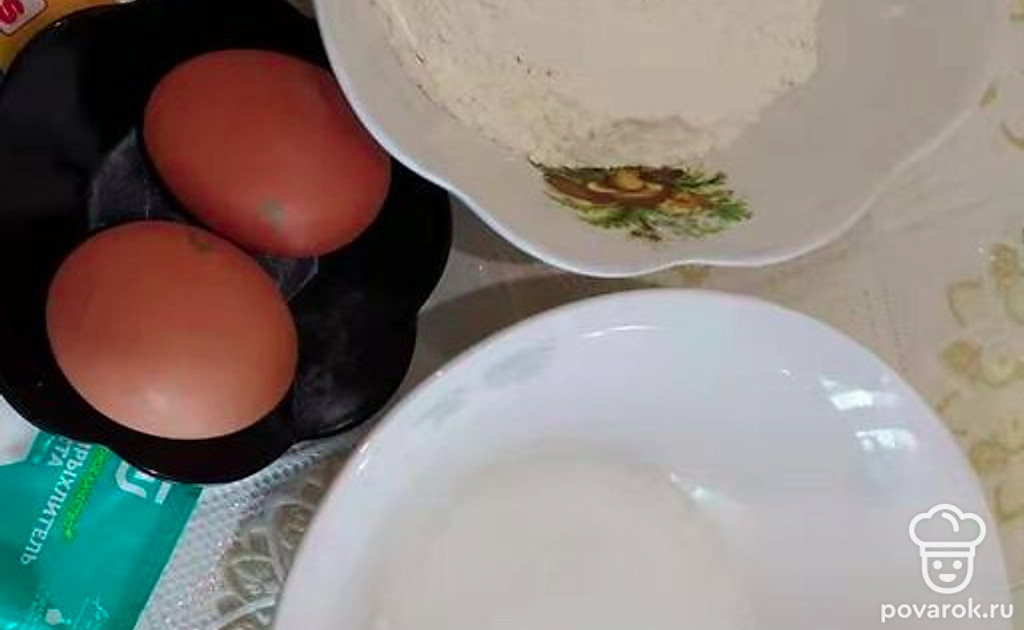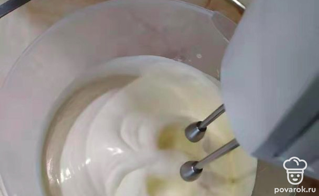 Взбивать яйца с сахаром миксером на максимальной скорости не меньше 10 минут, чтобы масса увеличилась в два раза.