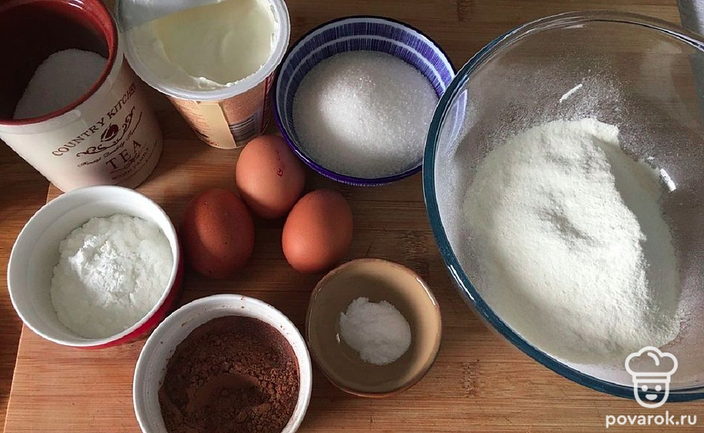 В миске смешайте сухие ингредиенты. Просейте муку, добавьте соду, крахмал, какао-порошок и соль. Перемешайте лопаткой.