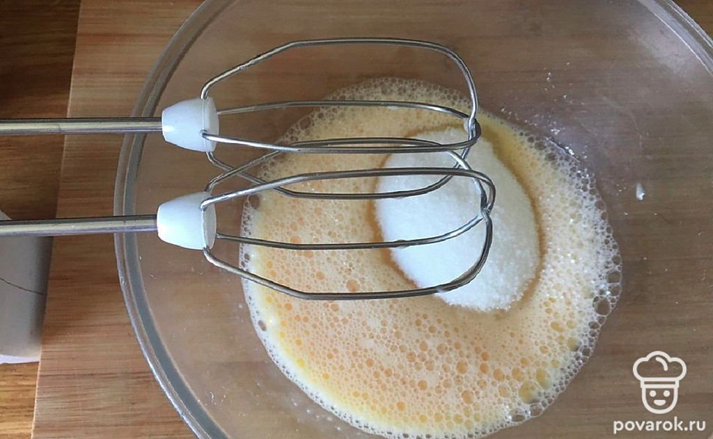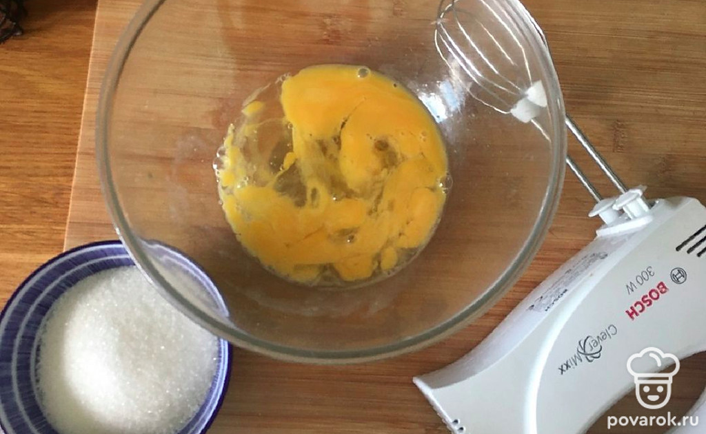 В большой миске взбейте яйца (комнатной температуры) с сахаром до получения пышной светлой массы.
