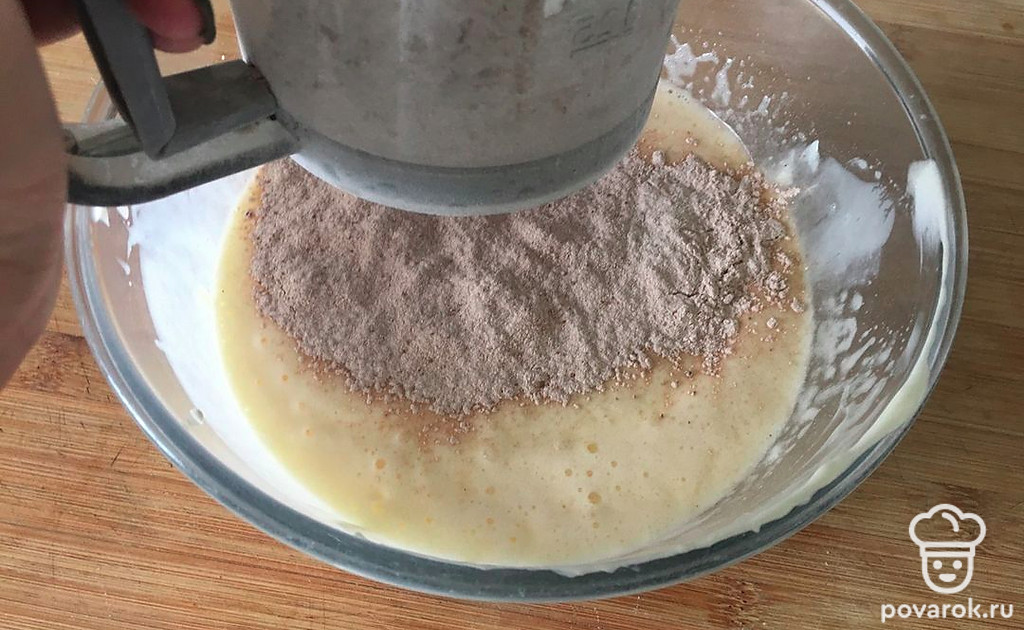 Просейте сухие ингредиенты в миску к жидким. Мука дополнительно обогатится воздухом, а бисквит будет пышным.