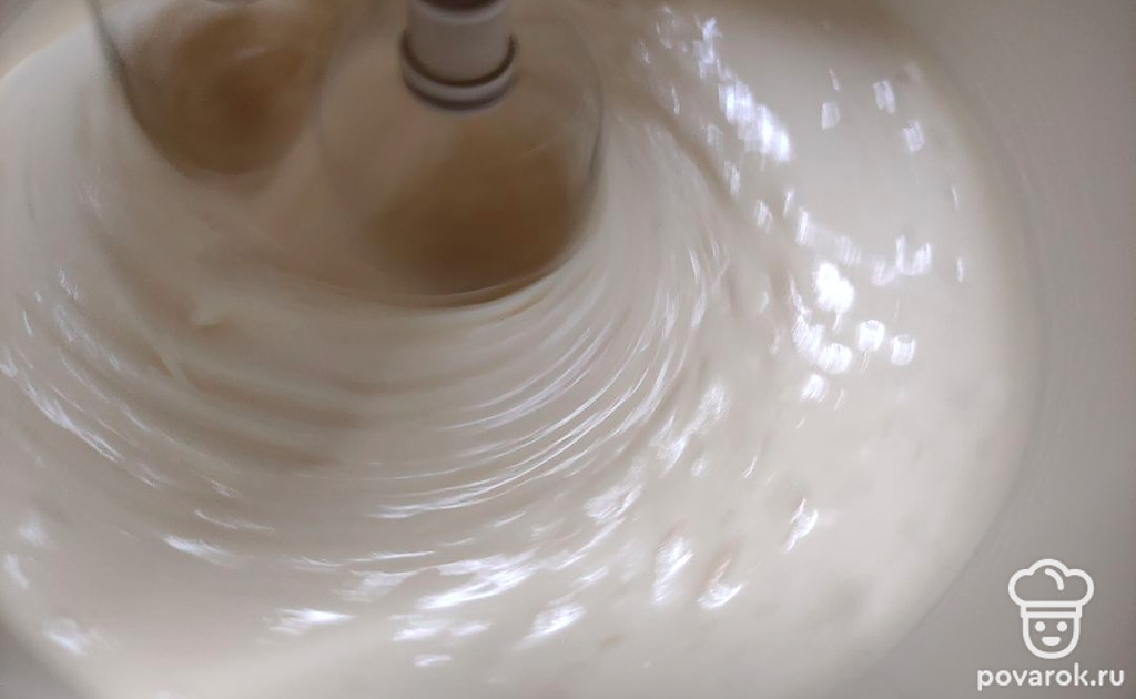 Яйца комнатной температуры взбить с сахаром и ванильным сахаром до увеличения в объёме в три раза, примерно 10-12 минут.