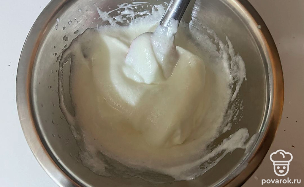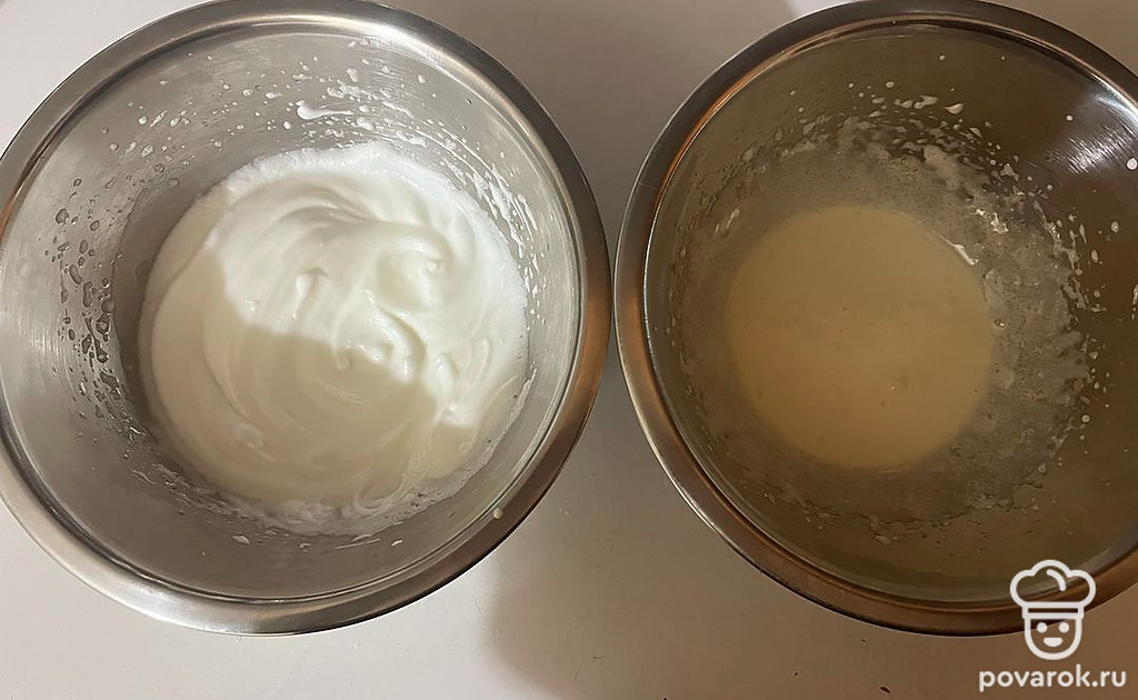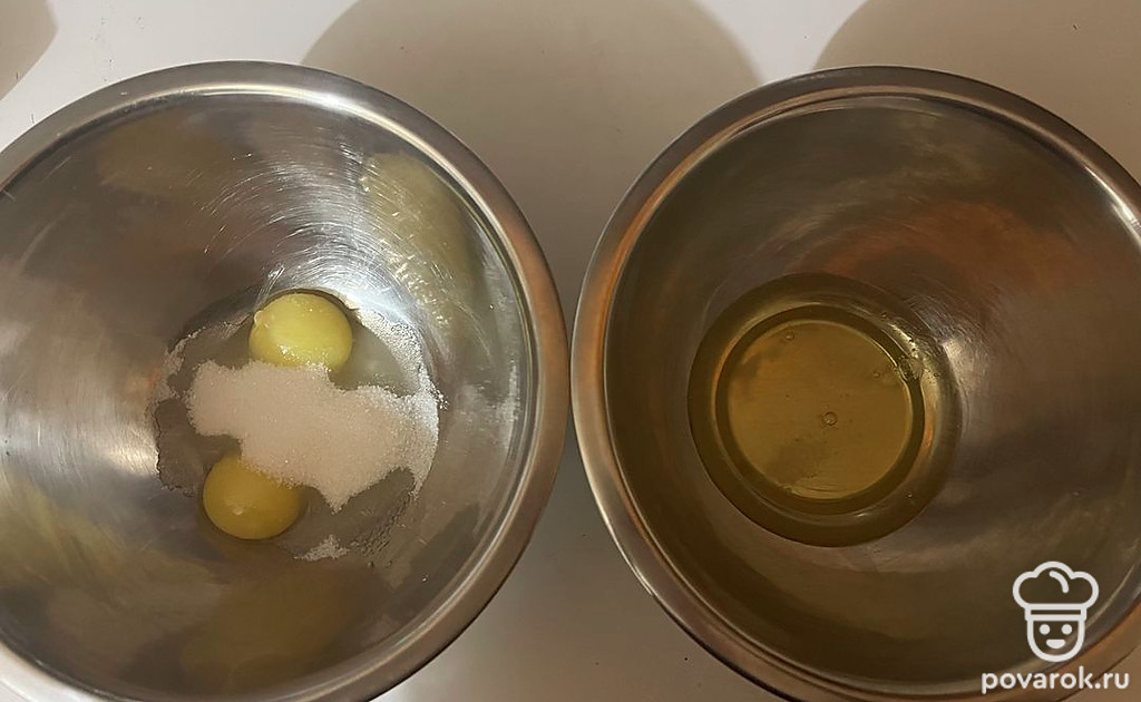 Яйца разделите на белки и желтки. К желткам добавьте сахар, а к белкам — соль.