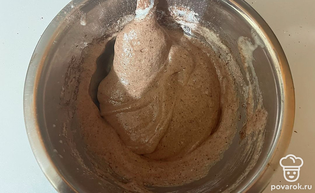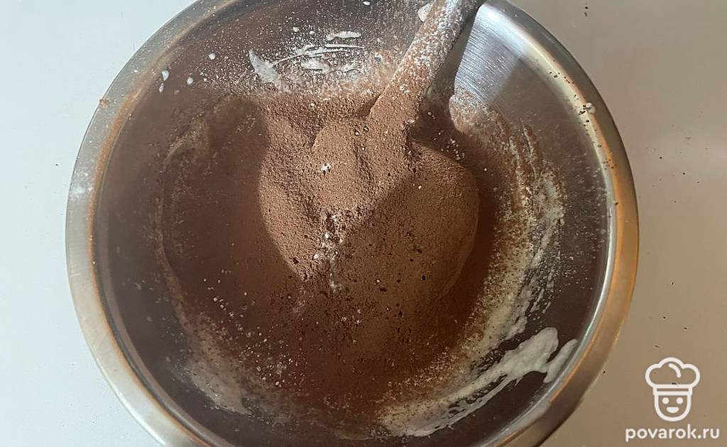 Просейте к яичной смеси муку, какао-порошок и разрыхлитель.