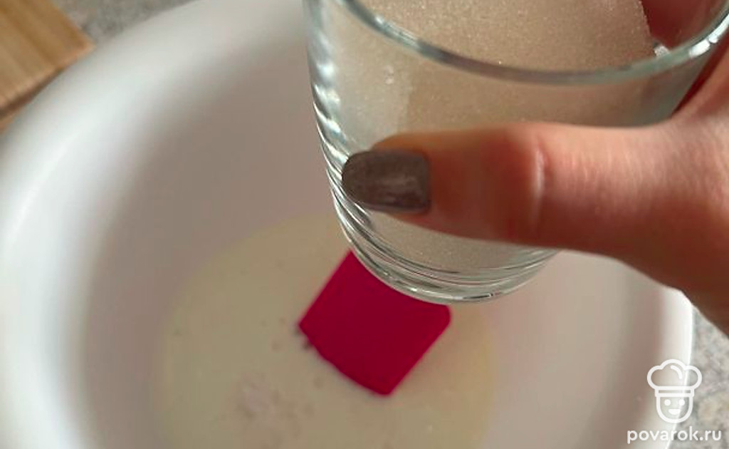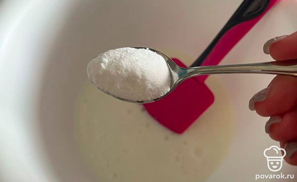 К соде с кефиром добавьте сахар, перемешайте смесь до растворения сахара.
