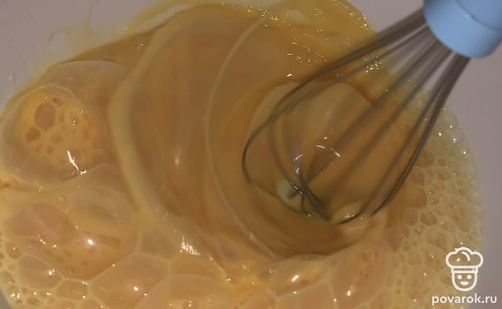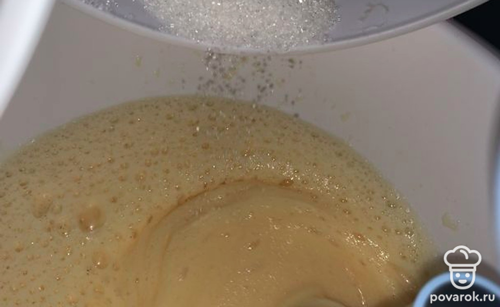 Добавить сахар к яйцам и взбить, должна получится пышная масса.