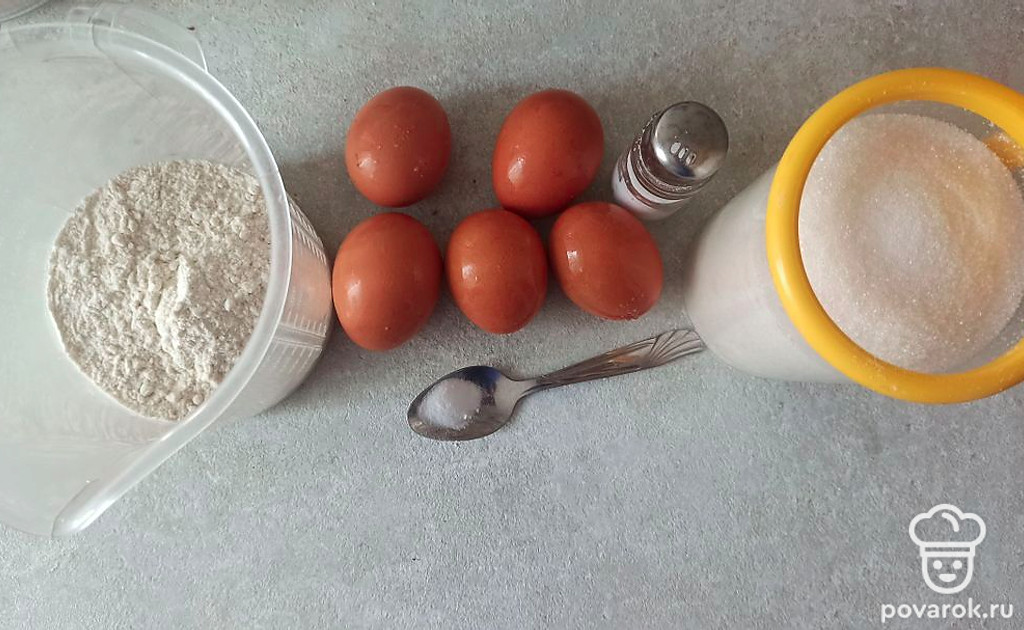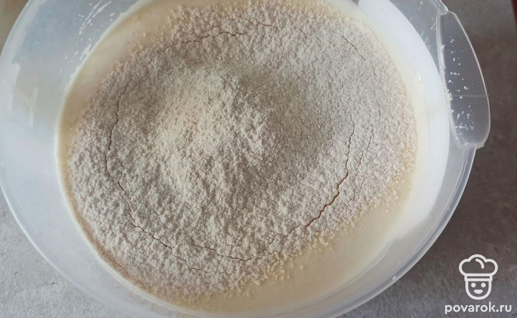Затем просеиваем муку, разрыхлитель. Добавляем соль и перемешиваем.