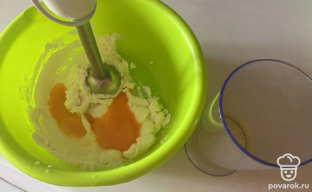 Творожную массу также перемешайте при помощи миксера с желтками.