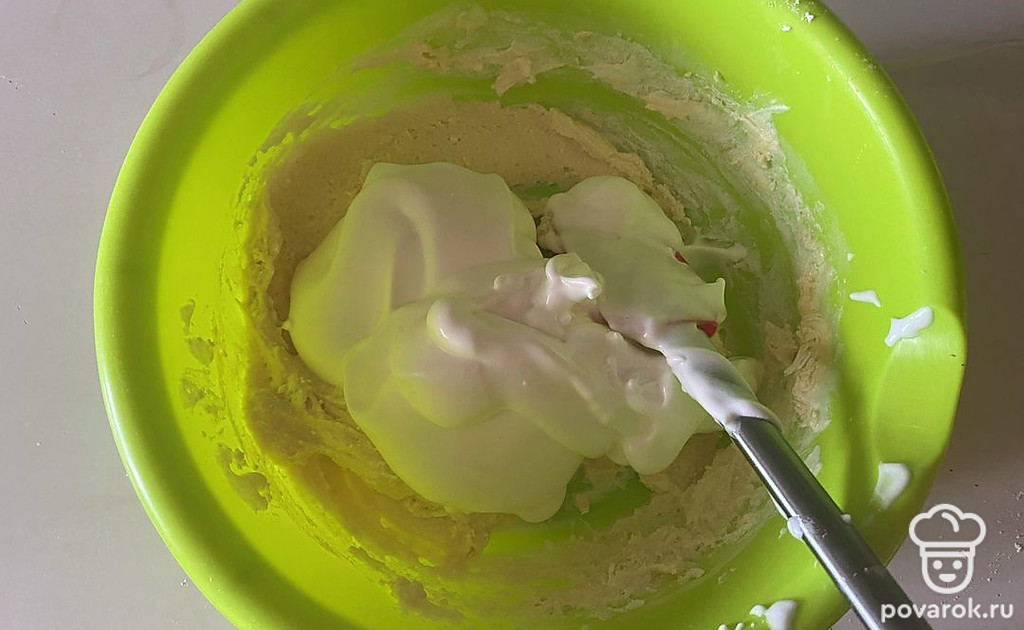 Далее белки соедините с творожным тестом и тщательно перемешайте до однородной массы с помощью лопатки.