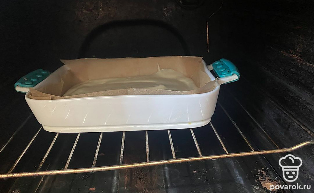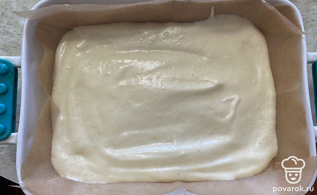 Вылейте тесто в форму, разровняйте поверхность теста лопаткой.