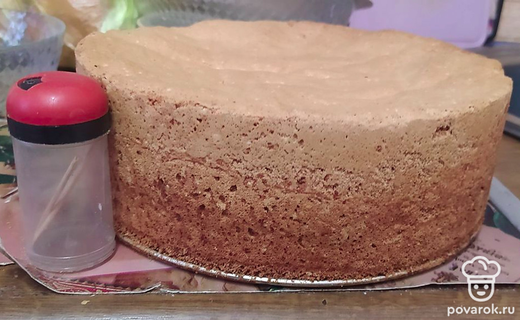 После приготовления оставьте бисквит остывать в духовке, затем заверните его в пищевую пленку и уберите в холодильник на ночь, чтобы бисквит был влажным и не крошился при нарезании.