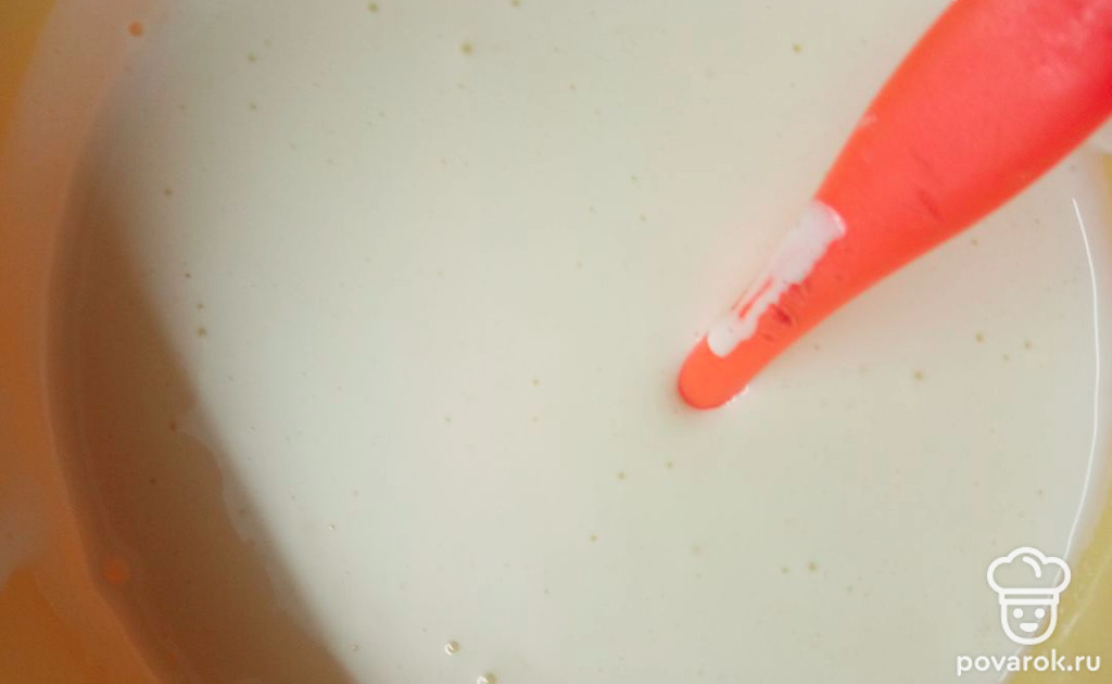 Консистенция должна получится, как на фото. Далее порциями добавляем просеянную муку с разрыхлителем и вымешиваем лопаткой.
