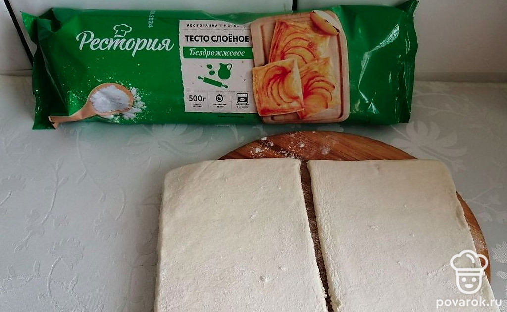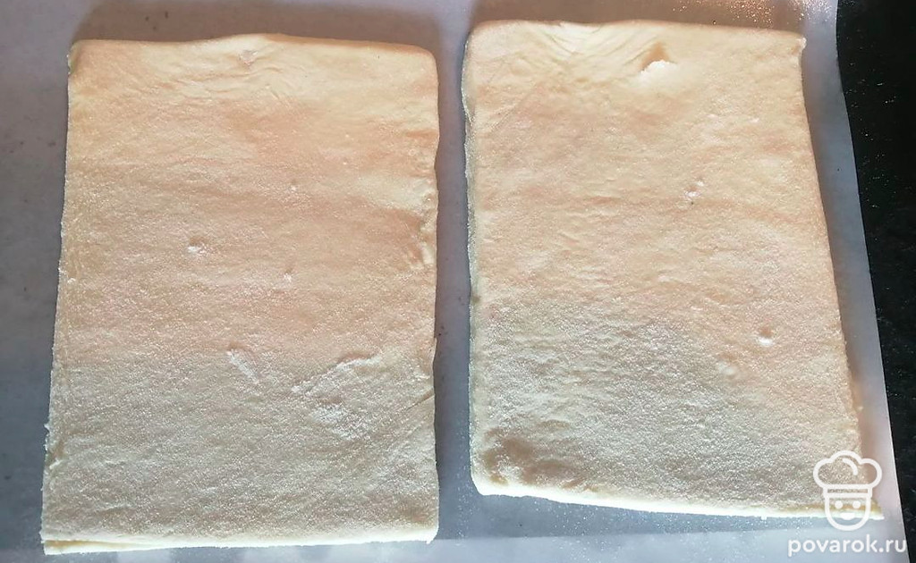 Слоеное тесто раскатайте. Отрежьте 2 равных прямоугольника.