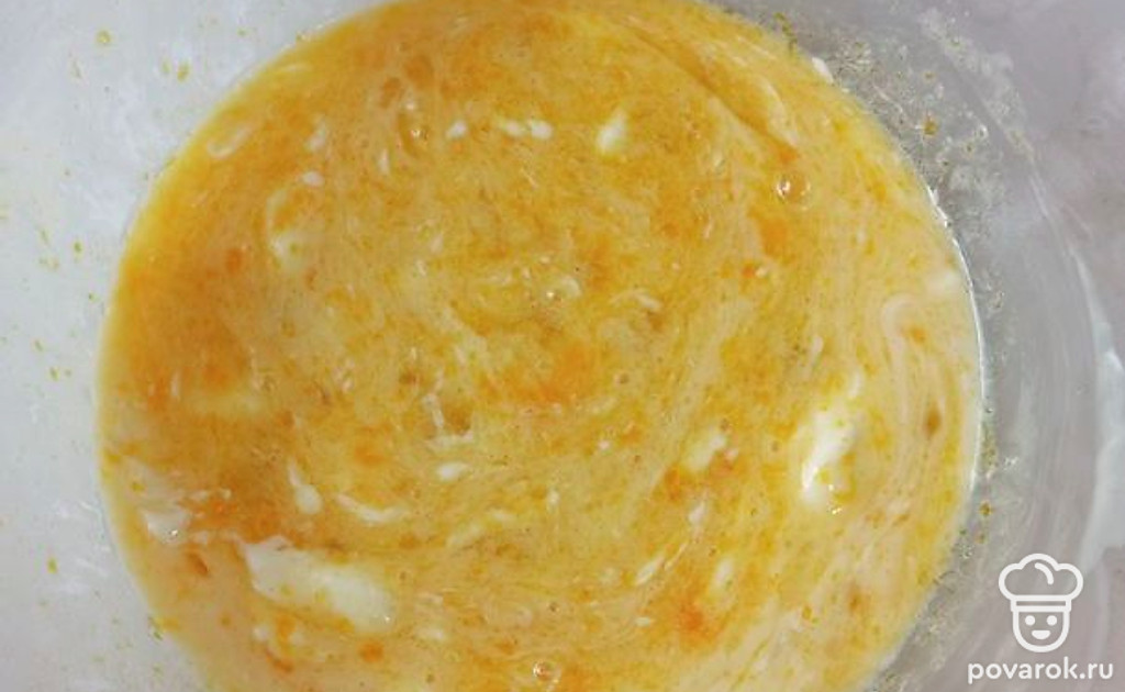 Добавьте 250 грамм муки, 10 грамм разрыхлителя. Перемешайте.