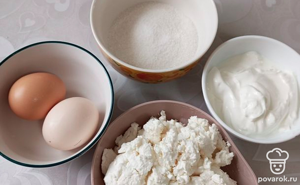 Смешайте 200 грамм творога, 200 грамм сметаны, 80 грамм сахара, 10 грамм ванильного сахара и 10 грамм крахмала.