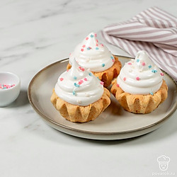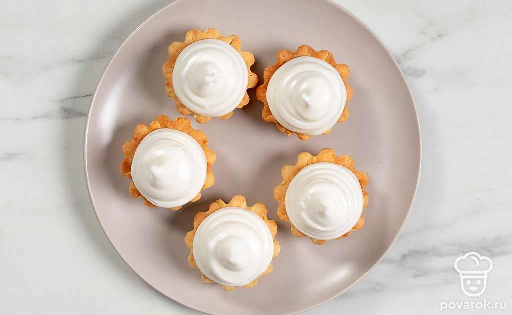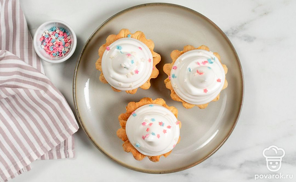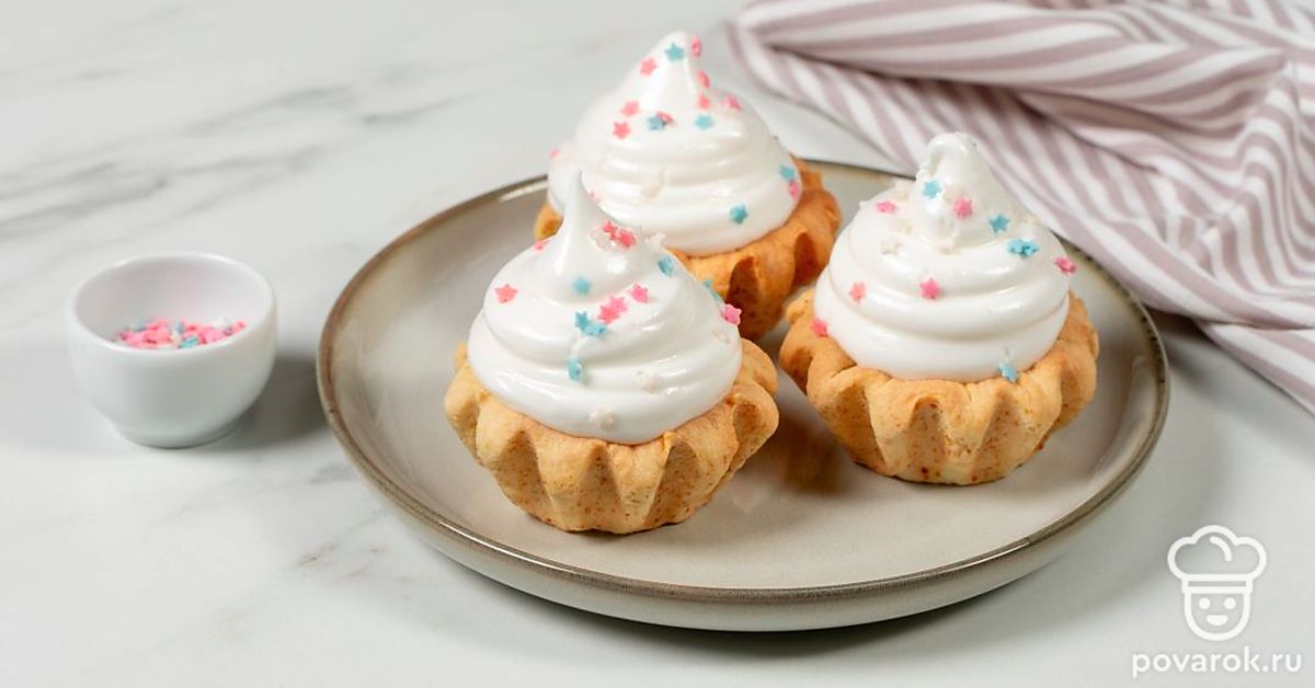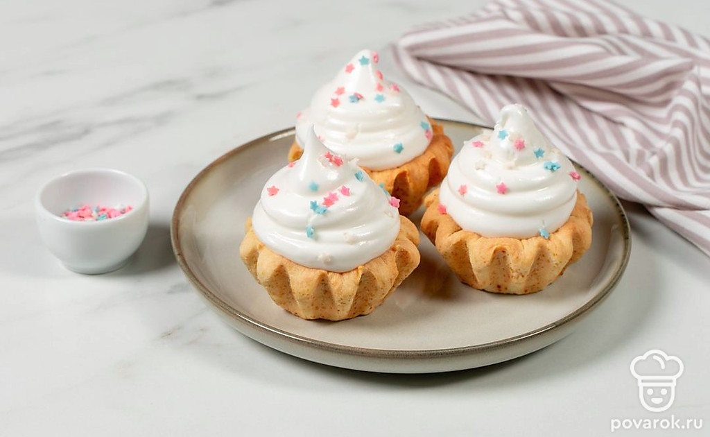 Попробуйте приготовить несложные корзинки с начинкой из белкового крема. Их можно подать в качестве десерта или взять с собой для сладкого перекуса. А состав крема позволяет умеренно есть их без вреда для фигуры. В качестве начинки можно взять не только покупной джем, но и домашнее варенье или свежие ягоды на ваш вкус. Добавьте любые топинги: кондитерскую посыпку, ягоды или тертый шоколад, чтобы разнообразить подачу.
