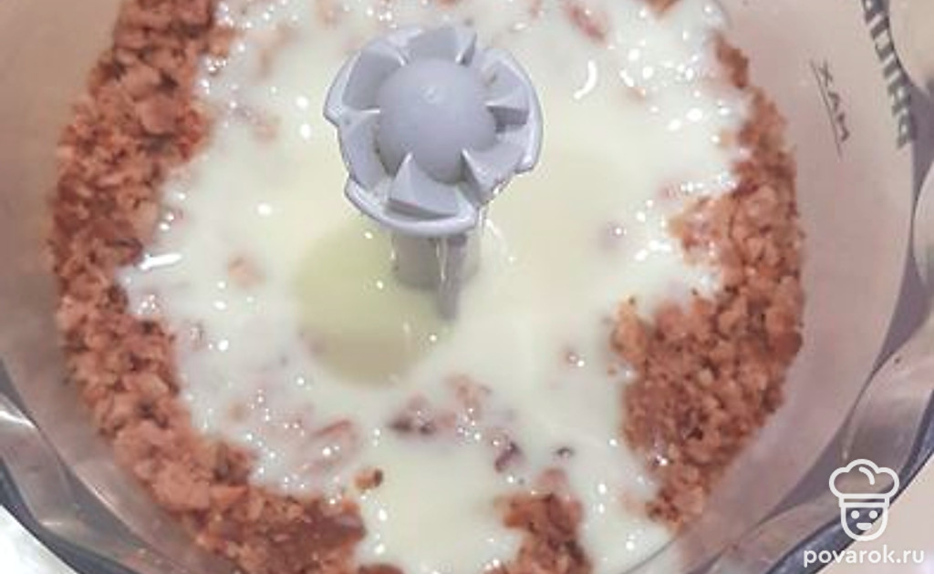 Измельчаем в блендере бисквит, добавляем сгущёнку, перемешиваем в однородную массу.
