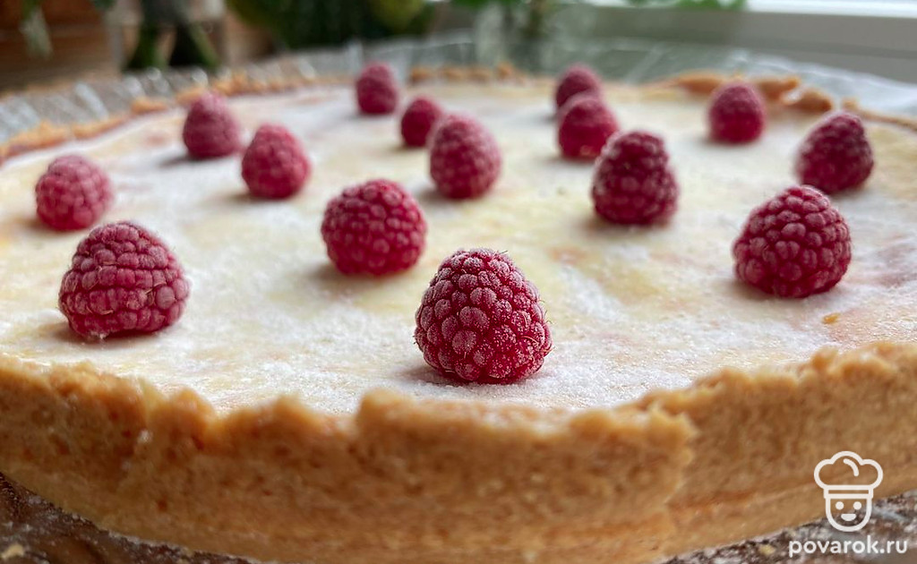 Когда пирог остынет посыпьте сверху сахарной пудрой и украсьте свежими ягодами.