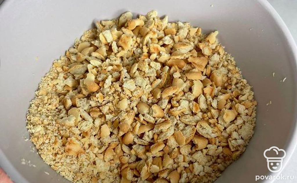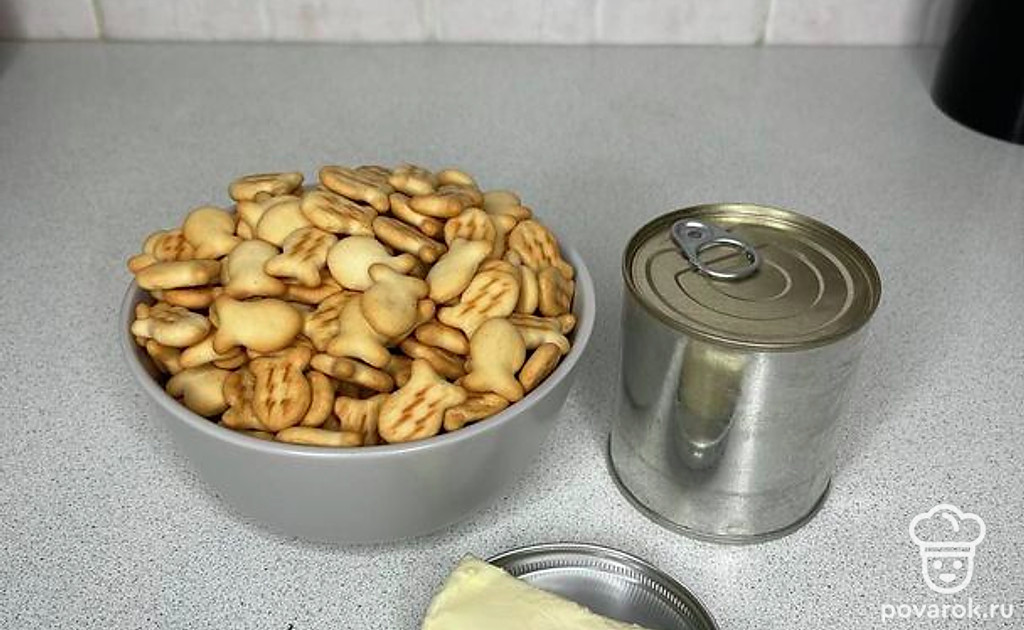 Сначала измельчаем крекеры. Я взяла крекеры-рыбки. Можно измельчить в блендере, а можно просто в пакете побить толкушкой. Измельчаем так, чтобы остались и крупные кусочки печенья.