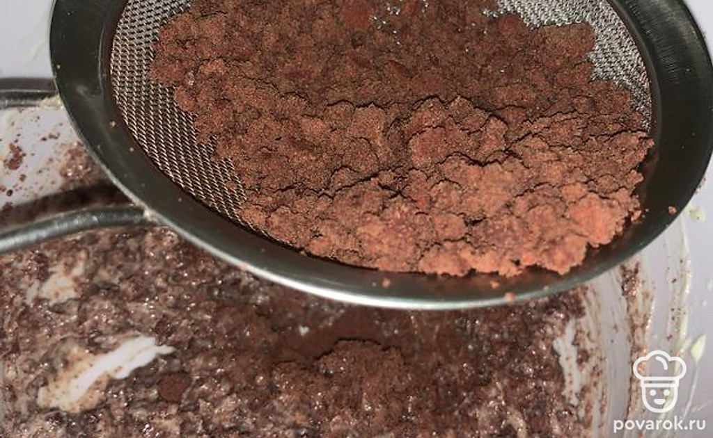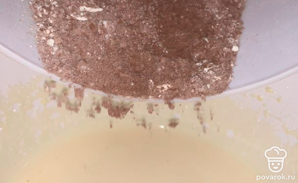 Добавить муку с какао к взбитым яйцам с сахаром.