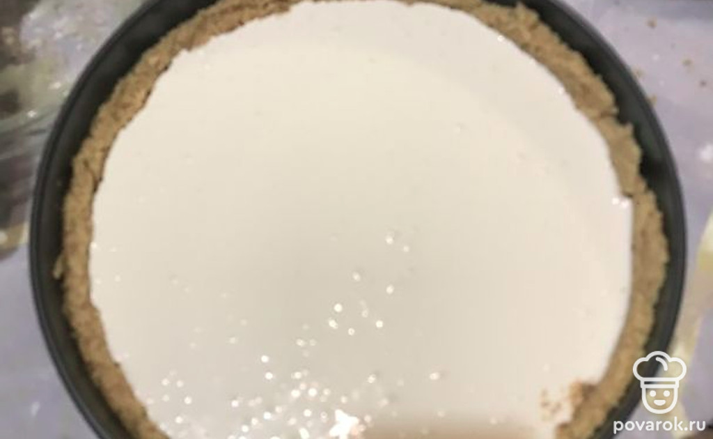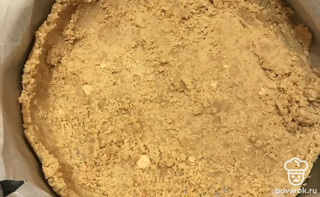 Застелите форму для выпечки пергаментной бумагой и насыпьте две трети печенья, чтобы покрыть все дно. Возьмите стакан и с помощью дна распределите печенье по поверхности. Всыпьте оставшуюся часть печенья и сформируйте бортики вокруг, помогая стаканом сделать их ровными. Уберите форму в морозилку на 20-30 минут.