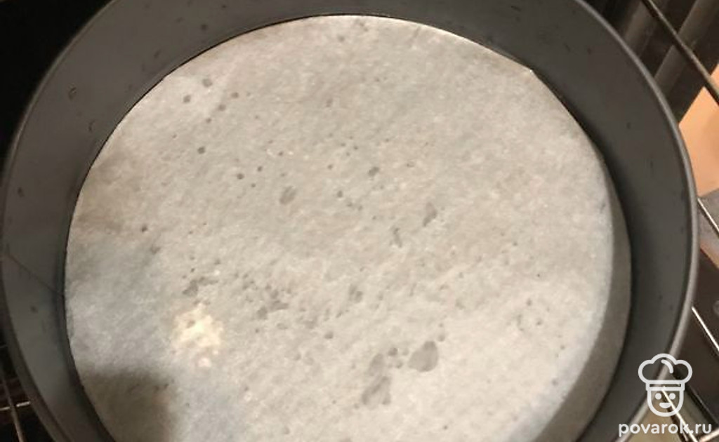 Сам чизкейк поставьте посередине духовки. Выпекайте 30 минут, после уменьшите температуру до 150 °С и выпекайте еще 30 минут. Далее выключите духовку и оставьте чизкейк на 2-3 часа пусть остывает. После этого уберите чизкейк в холодильник (не в морозилку) и оставьте его там на 6-12 часов.