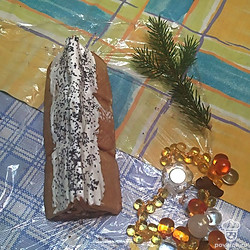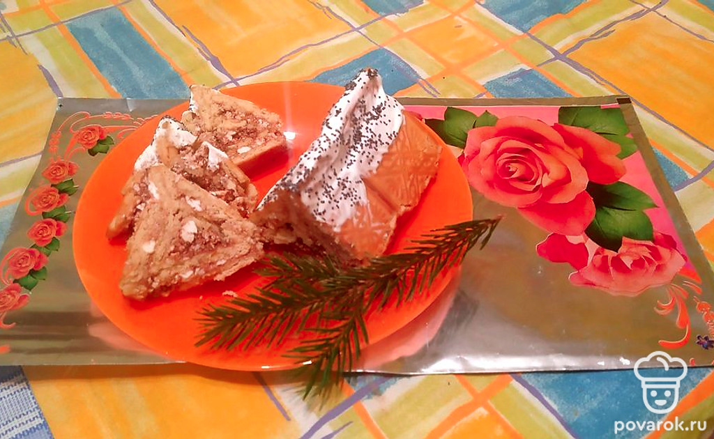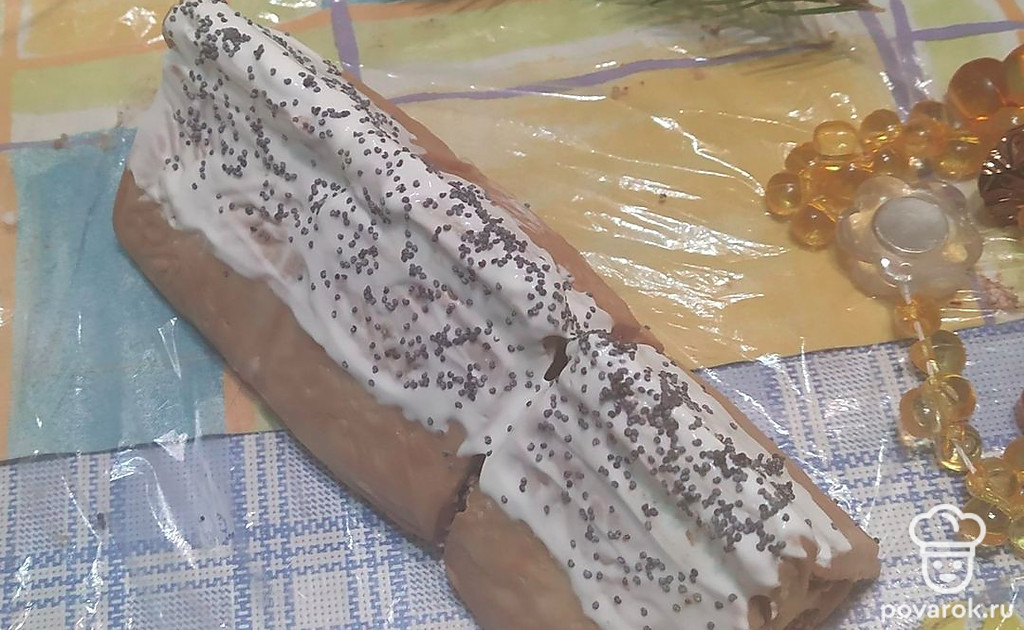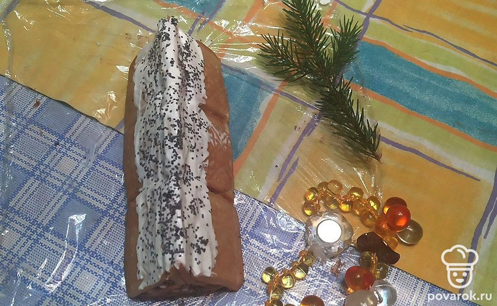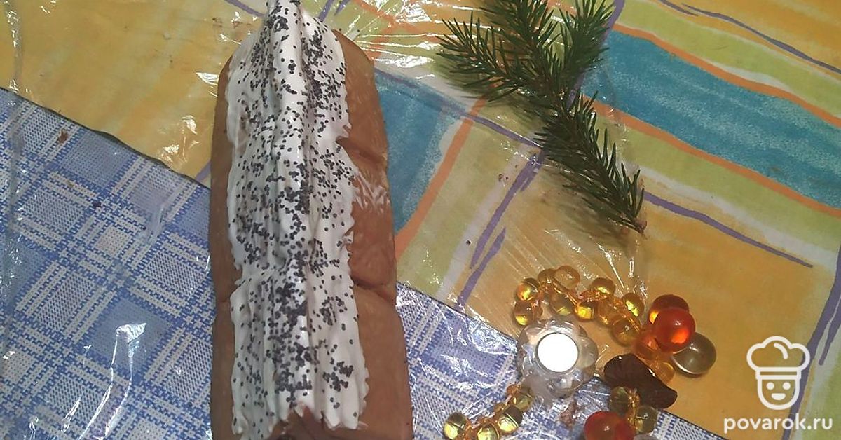 Достаньте изделие из холодильника. Отогните края пленки. Промажьте верх «хуторка» творогом без какао. Обсыпьте маком, как на фото.