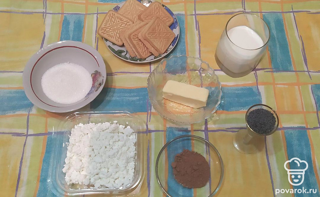 Подготовьте все ингредиенты. Молоко чуть подогрейте. Масло растопите. Шестую часть творога отложите на формирование крыши «хуторка». Остальное смешайте с маслом, какао и сахаром.