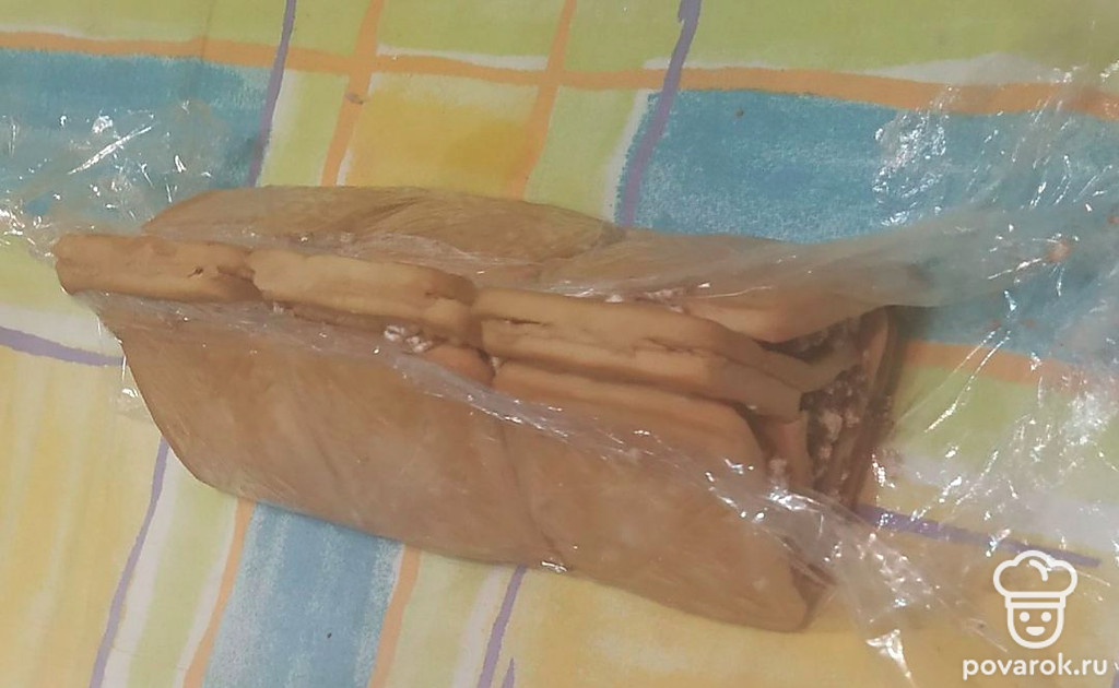 Приподнимите пленку с двух сторон одновременно, чтобы получился треугольник, как на фото. Поставьте в холодильник на 20 минут.